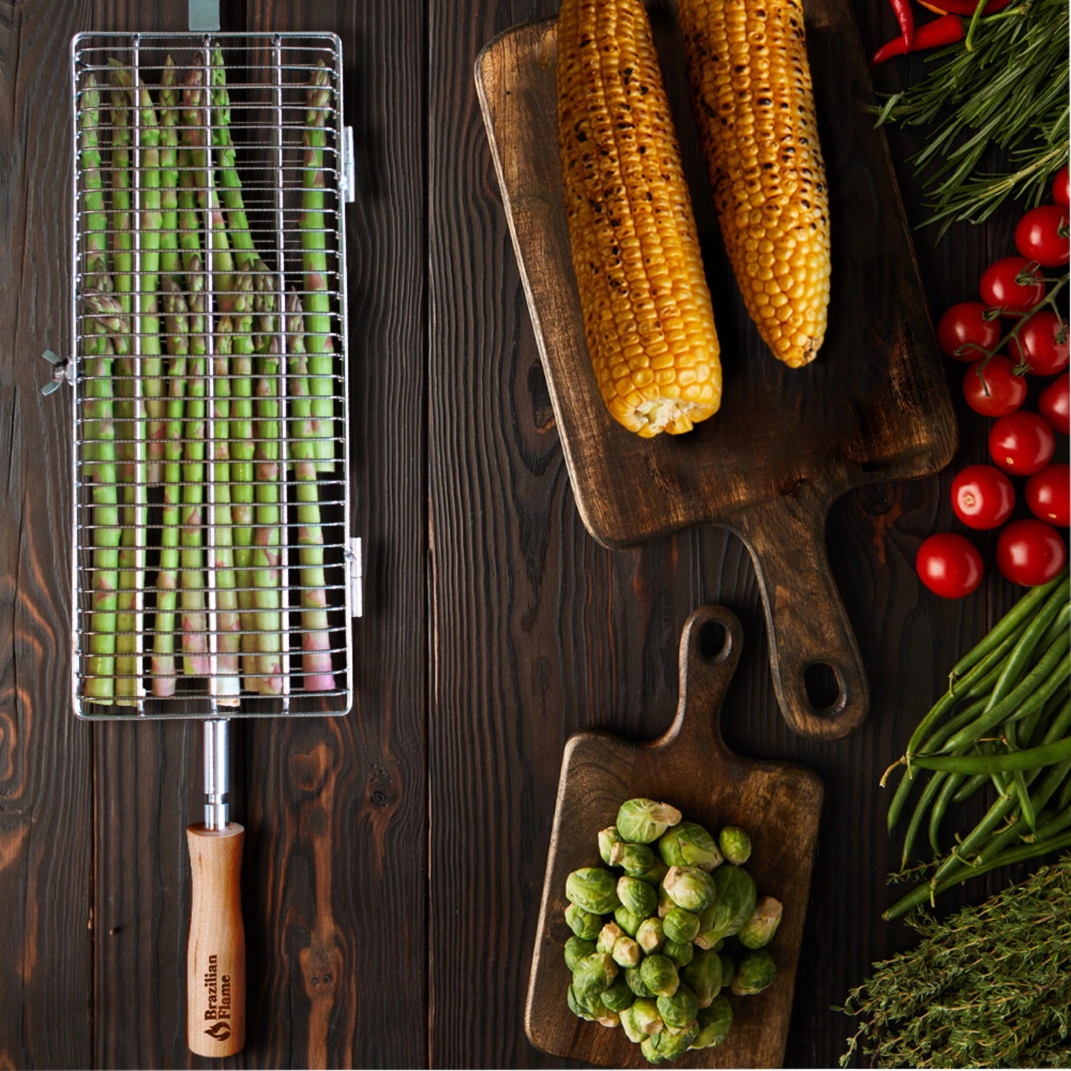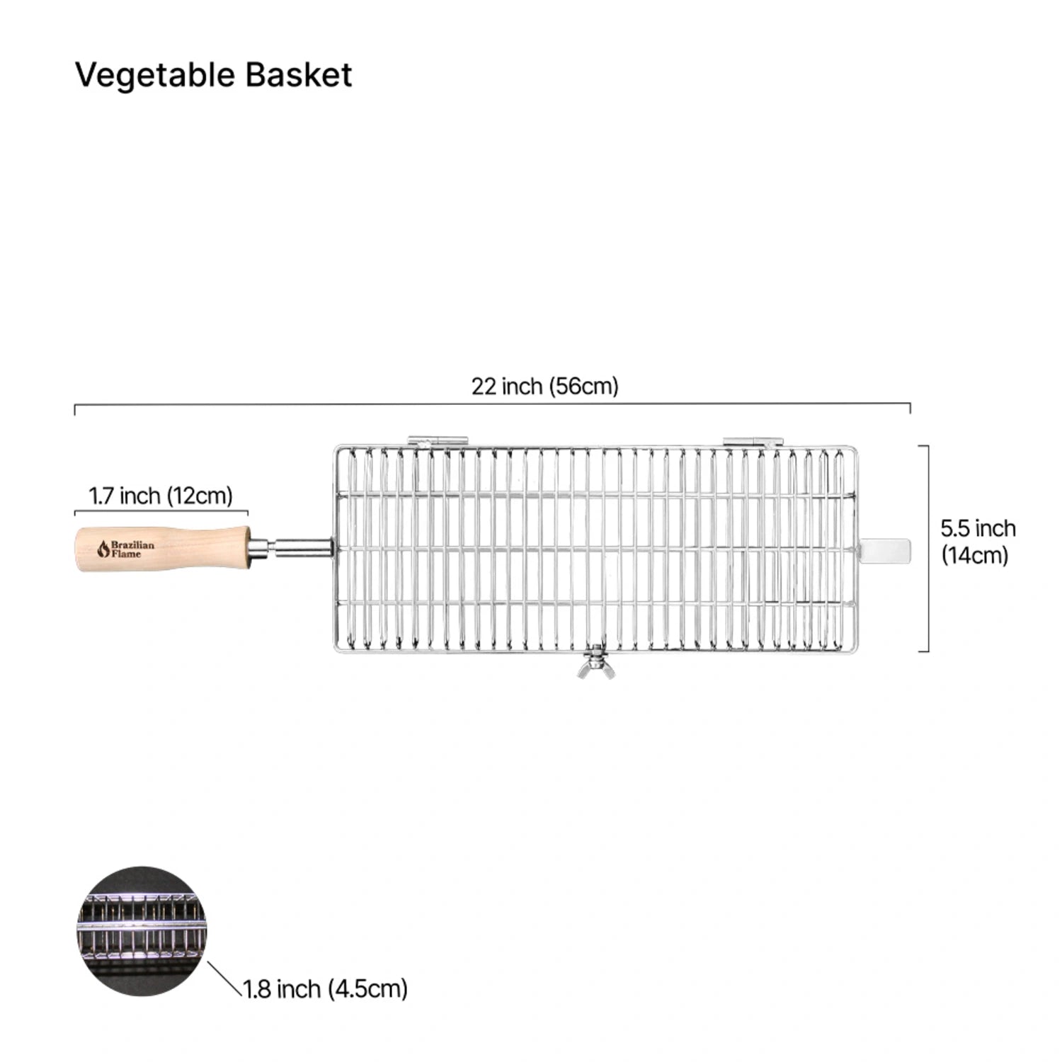 This vegetable basket is excellent for cooking vegetables in your Brazilian Flame Rotisserie Grill, including eggplants, squash, onions, peppers, asparagus, potatoes, mushrooms, cauliflower, broccoli, Brussels sprouts, etc.