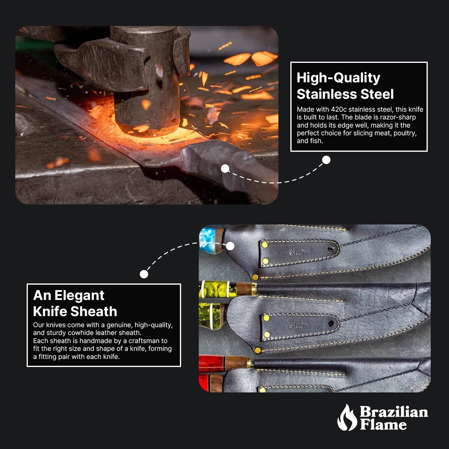 - UNIQUE JEWELRY DESIGN:Whether you are aPROFESSIONAL-LEVEL CHEF or just someone who likes to mess around in the kitchen, a proper knife is essential. Brazilian Flame is offering you the best and unique knives that are not only absolutely amazing for slicing, dicing, cleaning meats, and julienning but also attractive and durable. A great knife is the best way to prepare your food quickly and safely, and it is well worth the investment.