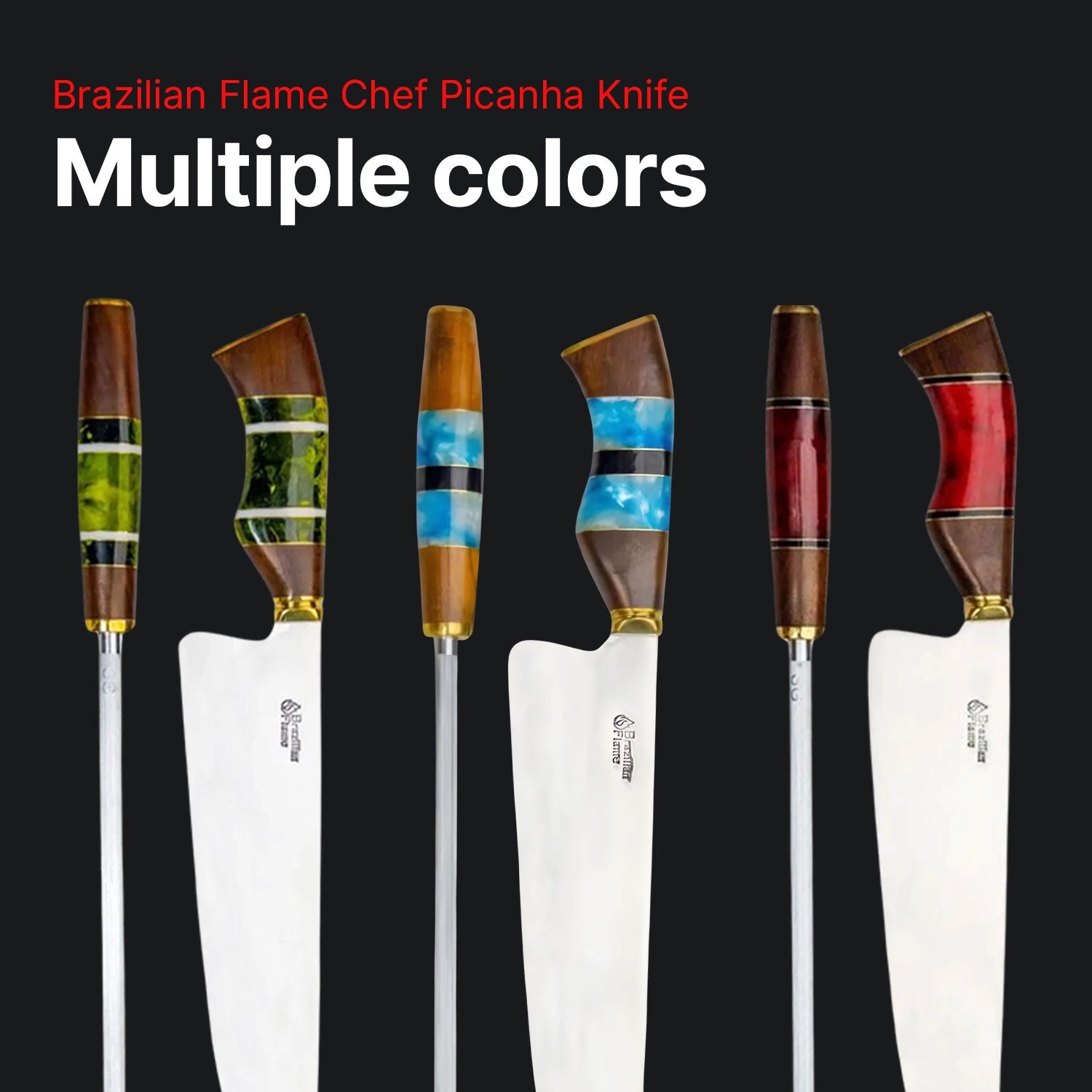 The Brazilian Flame Chef's Knife Picanha Set is a premium culinary tool designed for professional chefs and kitchen enthusiasts. Crafted with meticulous attention to detail, this knife set includes a sharpener made from high-quality CHROME VANADIUM steel, ensuring long-lasting performance for generations to come. The knife itself is handcrafted using top-notch 420c stainless steel, renowned for its surgical-grade quality. With a mirror-polished finish, military-grade strength, and a razor-sharp blade, this knife delivers precise cuts, durability, and low maintenance. Its balanced weight and ergonomic design make it ideal for prolonged use in the kitchen.