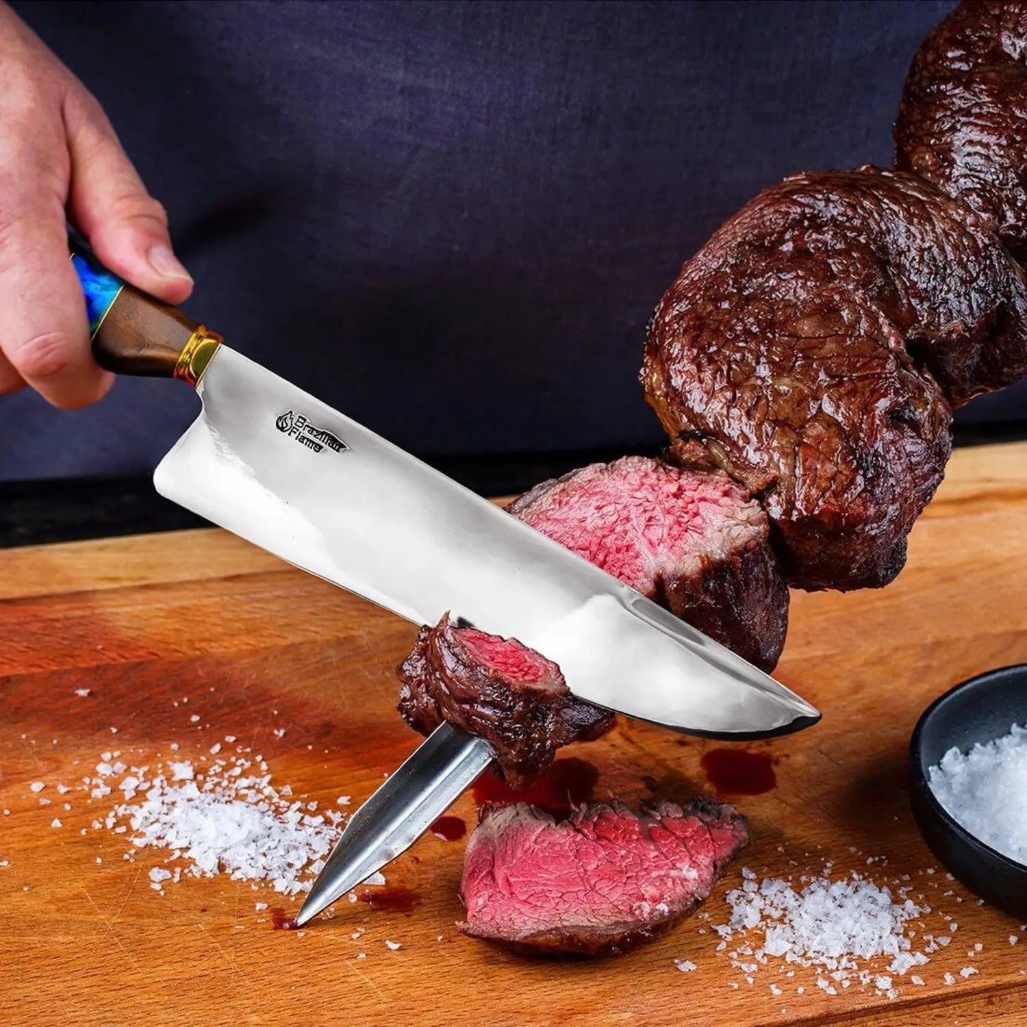 - CHEF'S KNIFE - PICANHA SET:This set includes a sharpener made with CHROME VANADIUM steel, ensuring that your knife will be around for future generations to enjoy. This knife is made with handmade, high-quality 420c stainless steel used in surgical applications. It is hand-finished to a mirror polish and provides military-grade strength, lifelong durability, precise cut, razor-sharp blade, and a low level of maintenance. This knife remains sharp for a long time. It provides a perfect weight and balance for use during a long period.