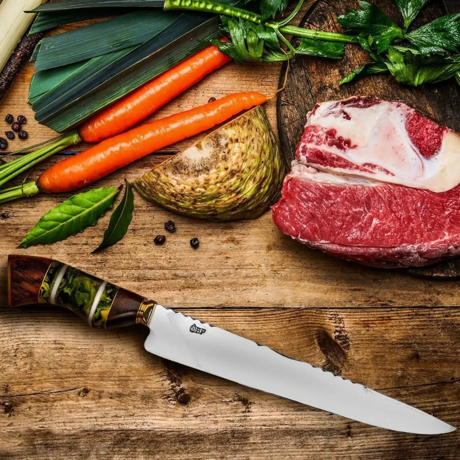 - CHEF VERSATILE: Crafted by hand from high-quality 420c stainless steel, its military-grade strength, lifelong durability, precise cutting ability, razor-sharp edge, and low maintenance requirements make it a reliable tool. The blade remains sharp over extended periods, offering an ideal balance and weight for prolonged use.