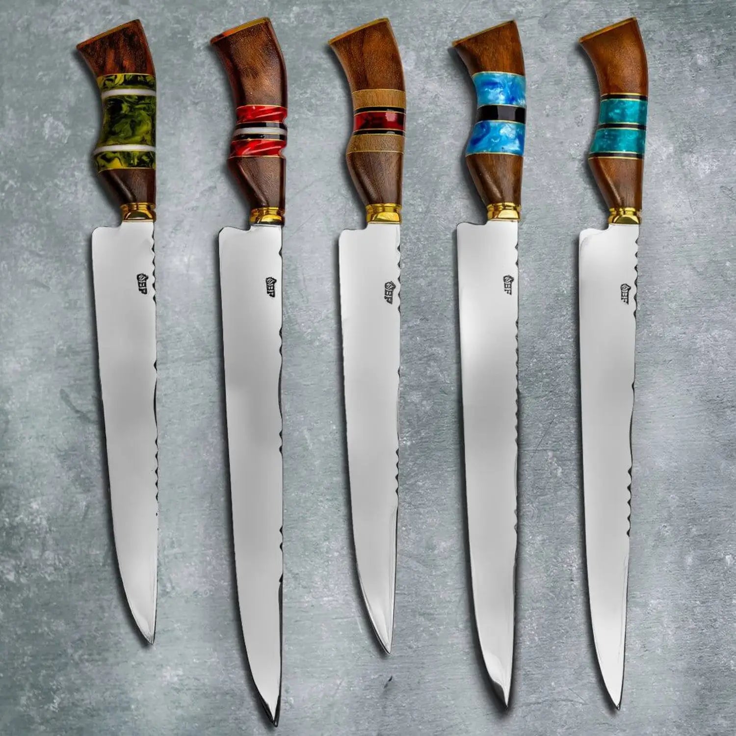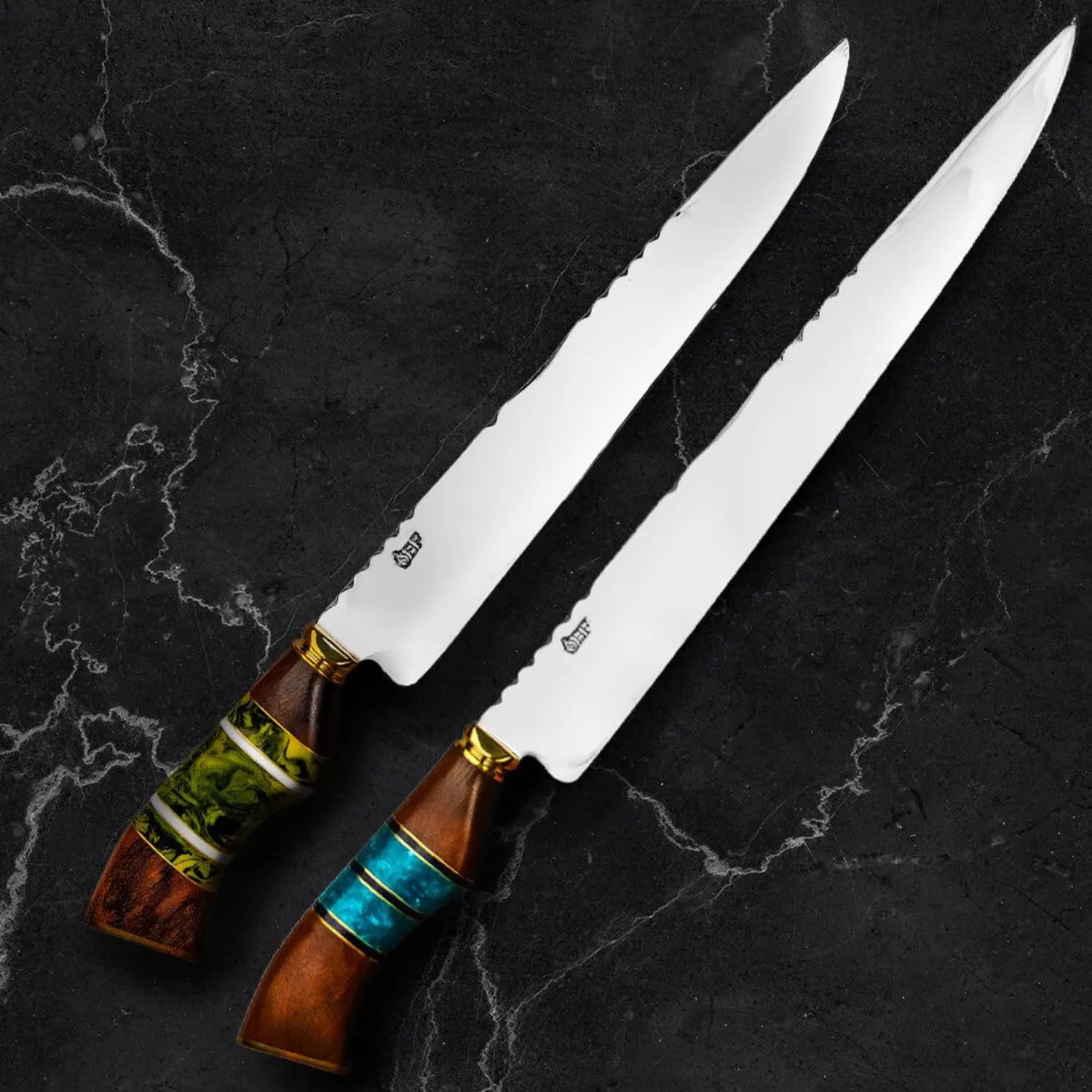 Every and each one of our knives are made with a unique and eye-catching handle design using high quality and chemically stabilized resin material together with the Imbuia wood. No knives are made the same. Each has a different color and unique shape. IT IS A REAL JEWELRY.