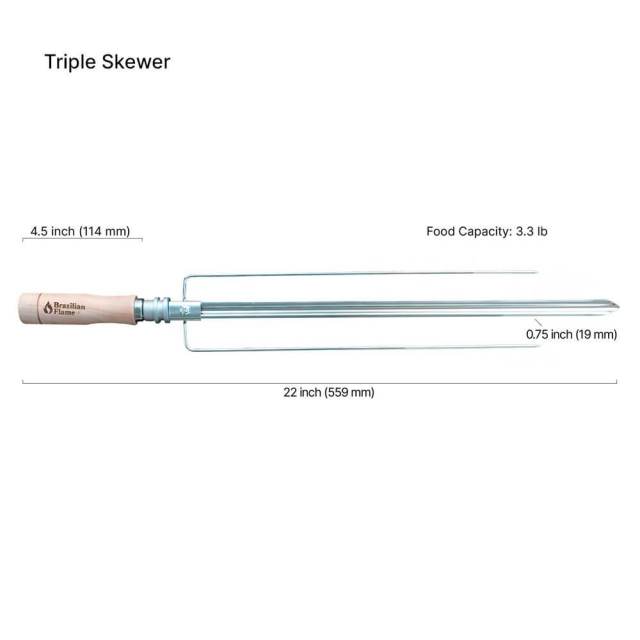 Each skewer holds up to 3.3 pounds (1.5 Kg) of food and rotates evenly in your Brazilian Flame Rotisserie Grill. It may be used together or separately. Make perfect barbecues every time. It cooks big pieces of meat quickly and easily without falling apart or burning in your rotisserie.