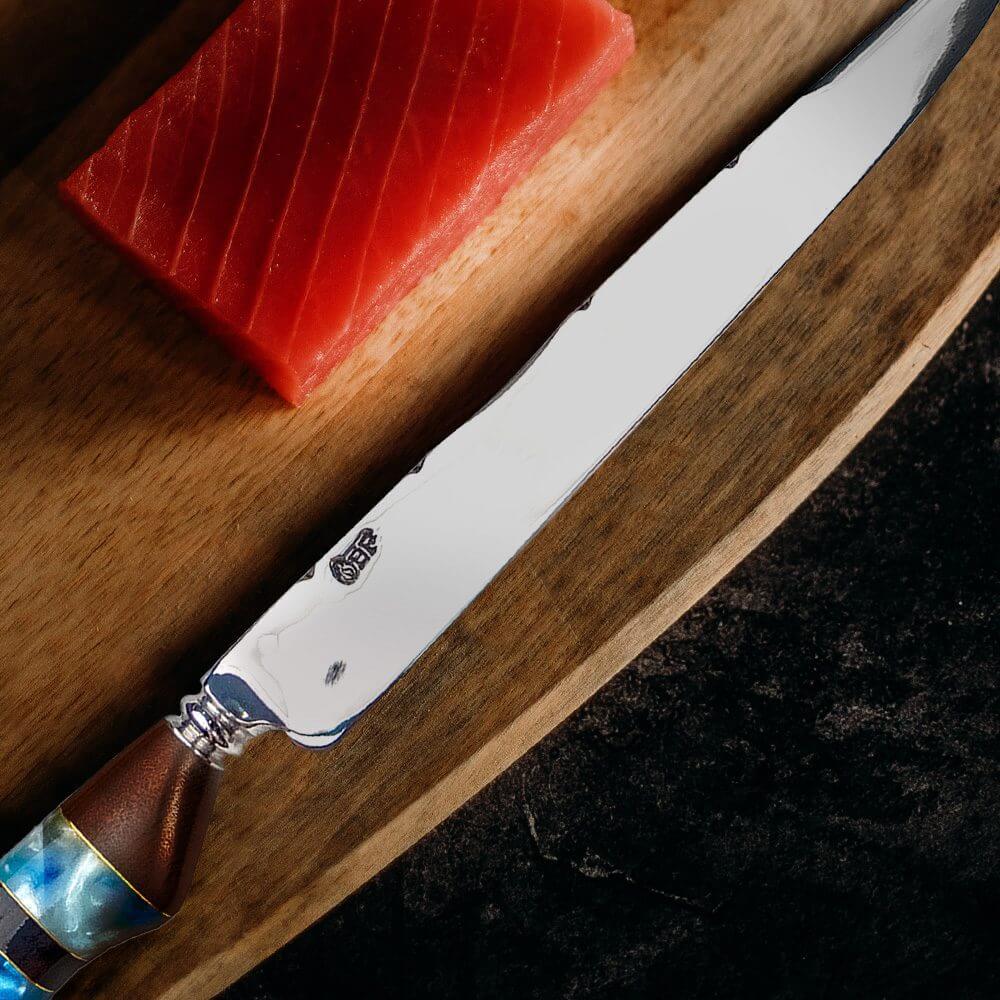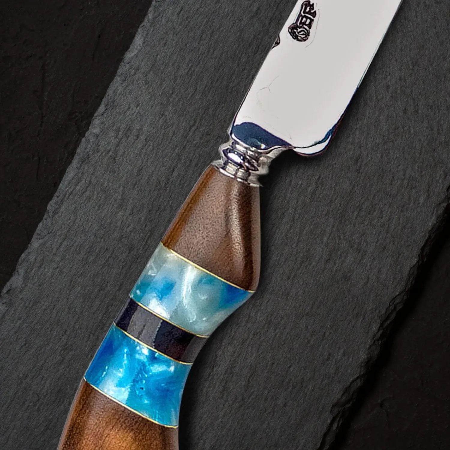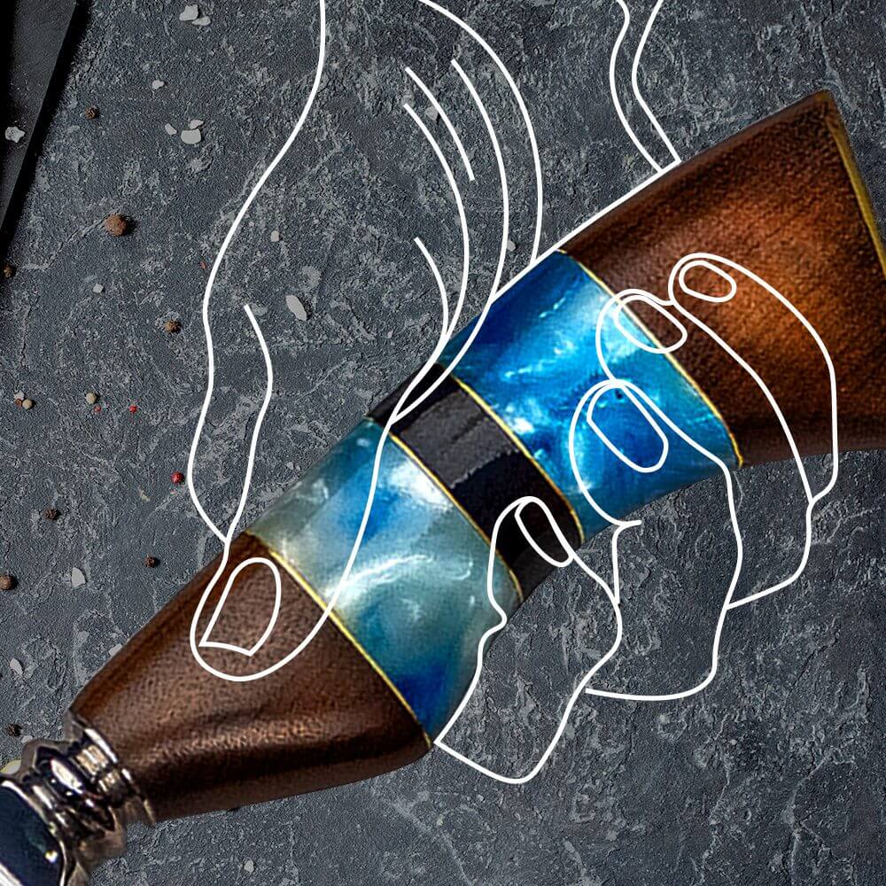Every and each one of our knives are made with a unique and eye-catching handle design using high quality and chemically stabilized resin material together with the Imbuia wood. No knives are made the same. Each has a different color and unique shape. IT IS A REAL JEWELRY.