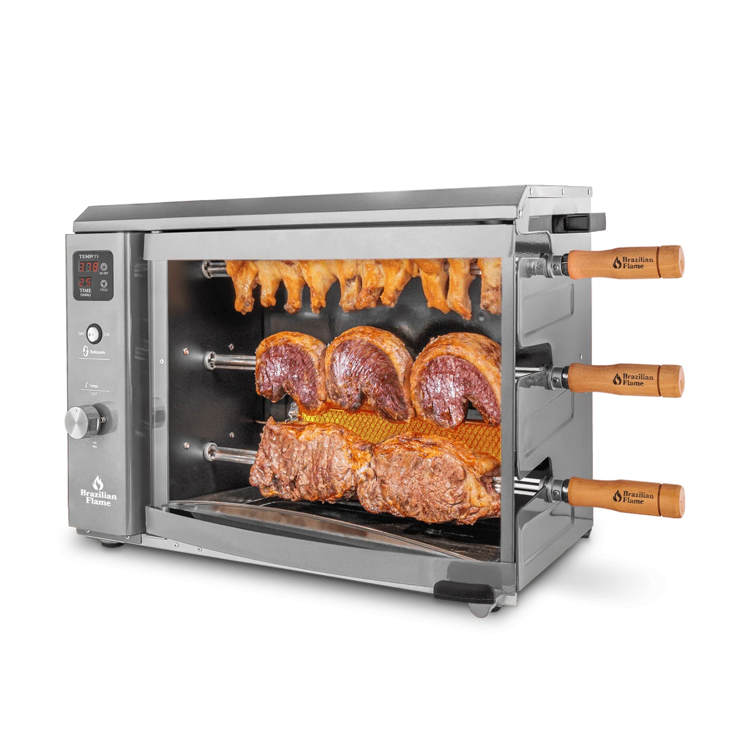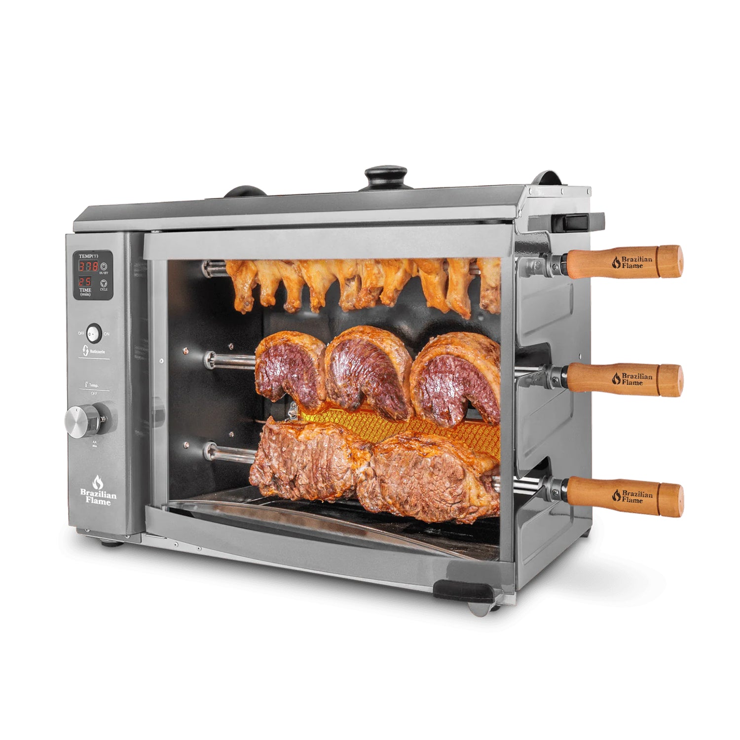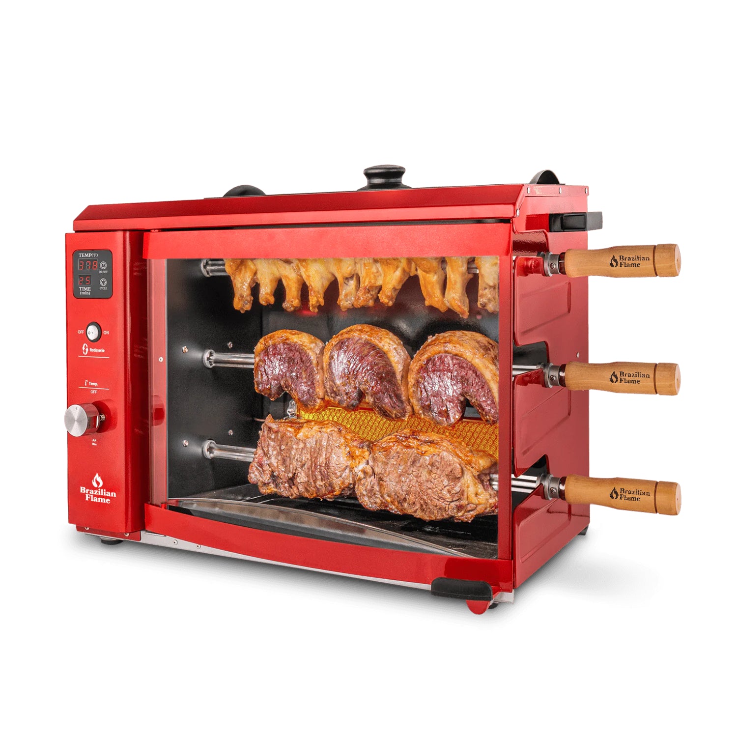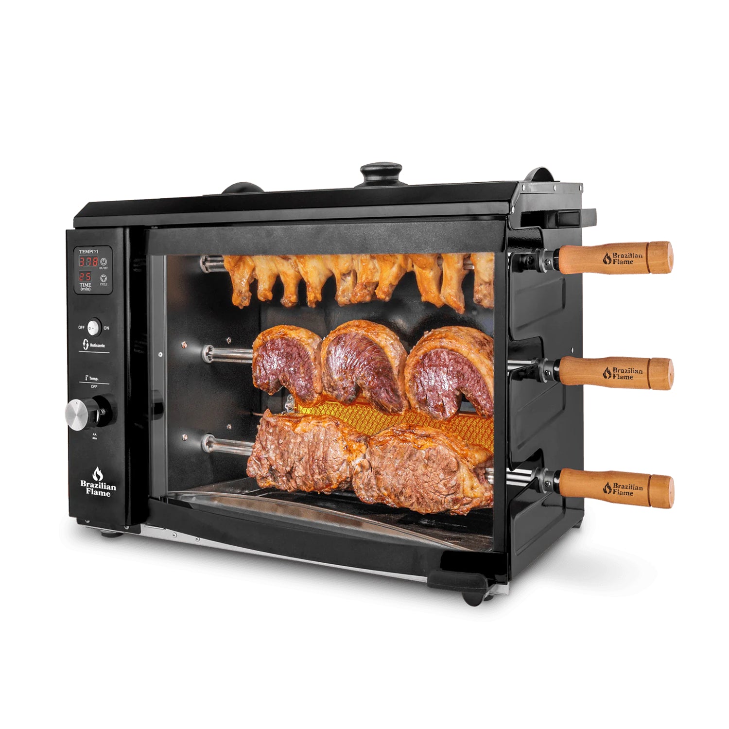 Brazilian Flame invites you to experience the authentic flavor of a Brazilian grill in the comfort of your own home. The grill allows you to cook meat, fish, vegetables and more in a centuries-old Brazilian style BBQ. A multi-skewer rotating system ensures your chicken, fish, steak, and vegetables are evenly cooked and much tastier than the oven, skillet, or standard grill. Modern design and convenient grease collecting tray make this barbecue roaster quick and easy to clean while state of the art technology allows for true BBQ flavor with no smoke! Electronic, individually controlled burners or heating elements on the back and a curved transparent glass door offer better visualization and better roasting control. Fans of barbecue, grilled steaks, Brazilian food, and outdoor enthusiasts, here is your chance to get your hands on the first of its kind in America.