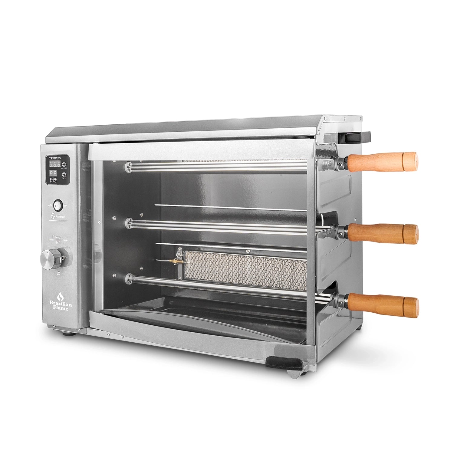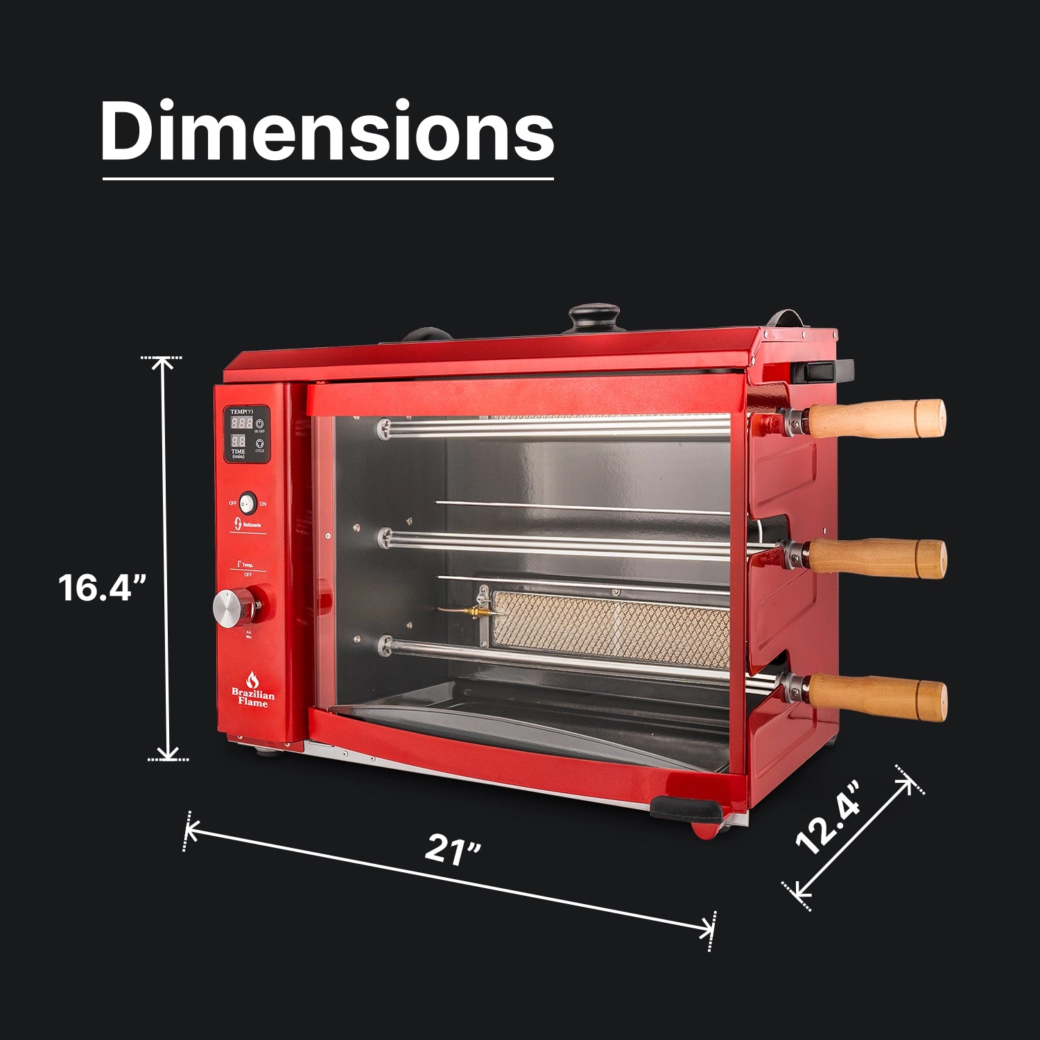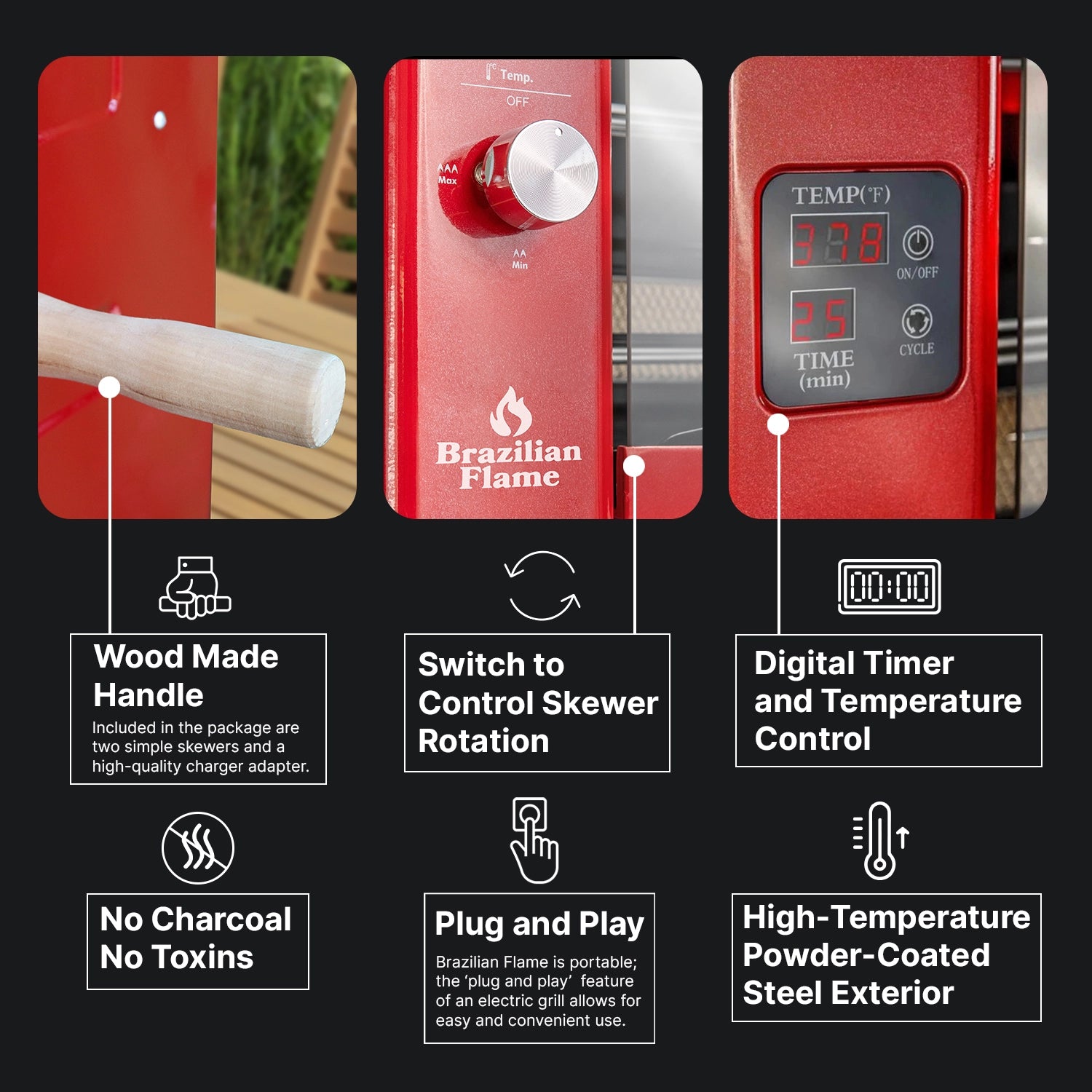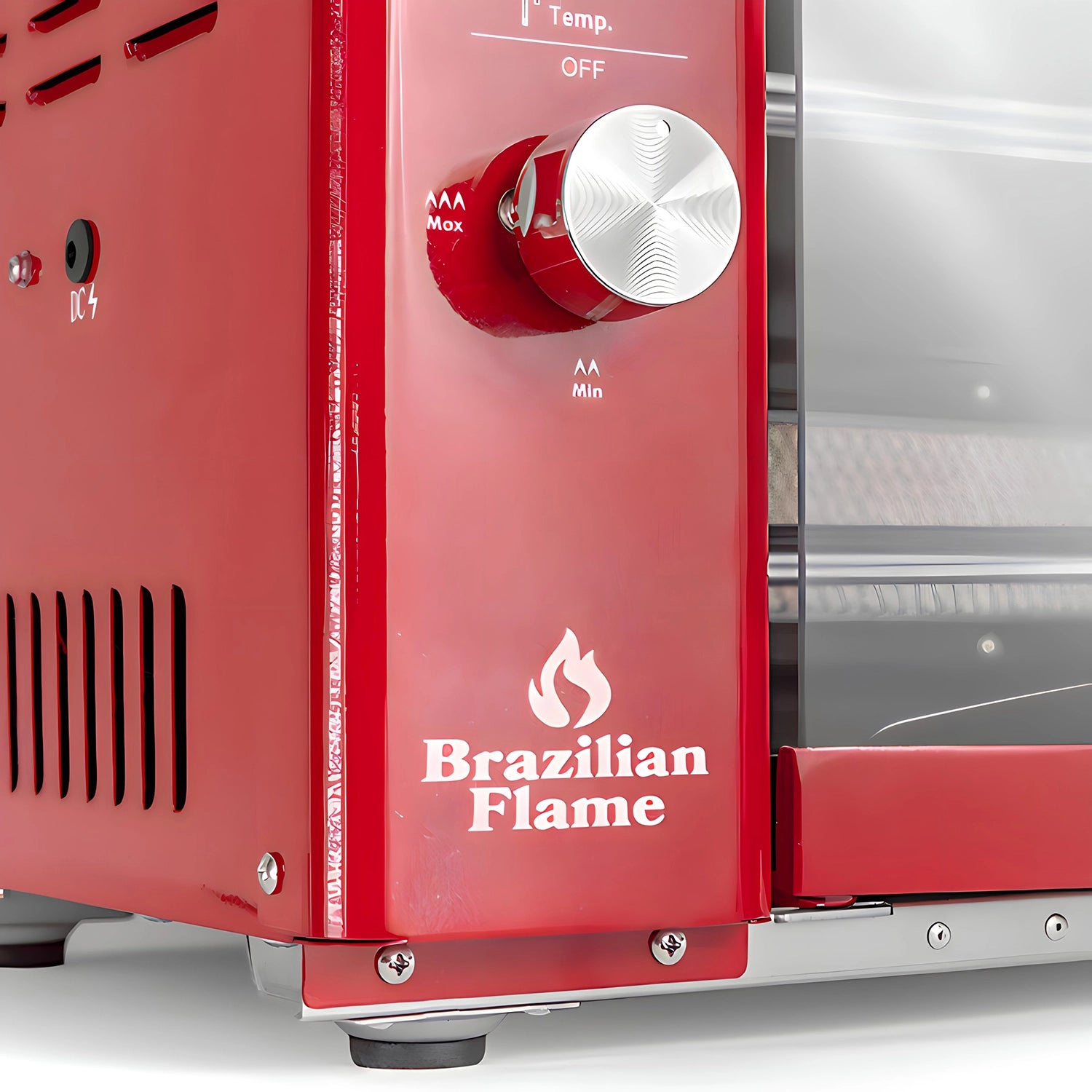 Brazilian Flame invites you to experience the authentic flavor of a Brazilian grill in the comfort of your own home. The grill allows you to cook meat, fish, vegetables and more in a centuries-old Brazilian style BBQ. A multi-skewer rotating system ensures your chicken, fish, steak, and vegetables are evenly cooked and much tastier than the oven, skillet, or standard grill. Modern design and convenient grease collecting tray make this barbecue roaster quick and easy to clean while state of the art technology allows for true BBQ flavor with no smoke! Electronic, individually controlled burners or heating elements on the back and a curved transparent glass door offer better visualization and better roasting control. Fans of barbecue, grilled steaks, Brazilian food, and outdoor enthusiasts, here is your chance to get your hands on the first of its kind in America.