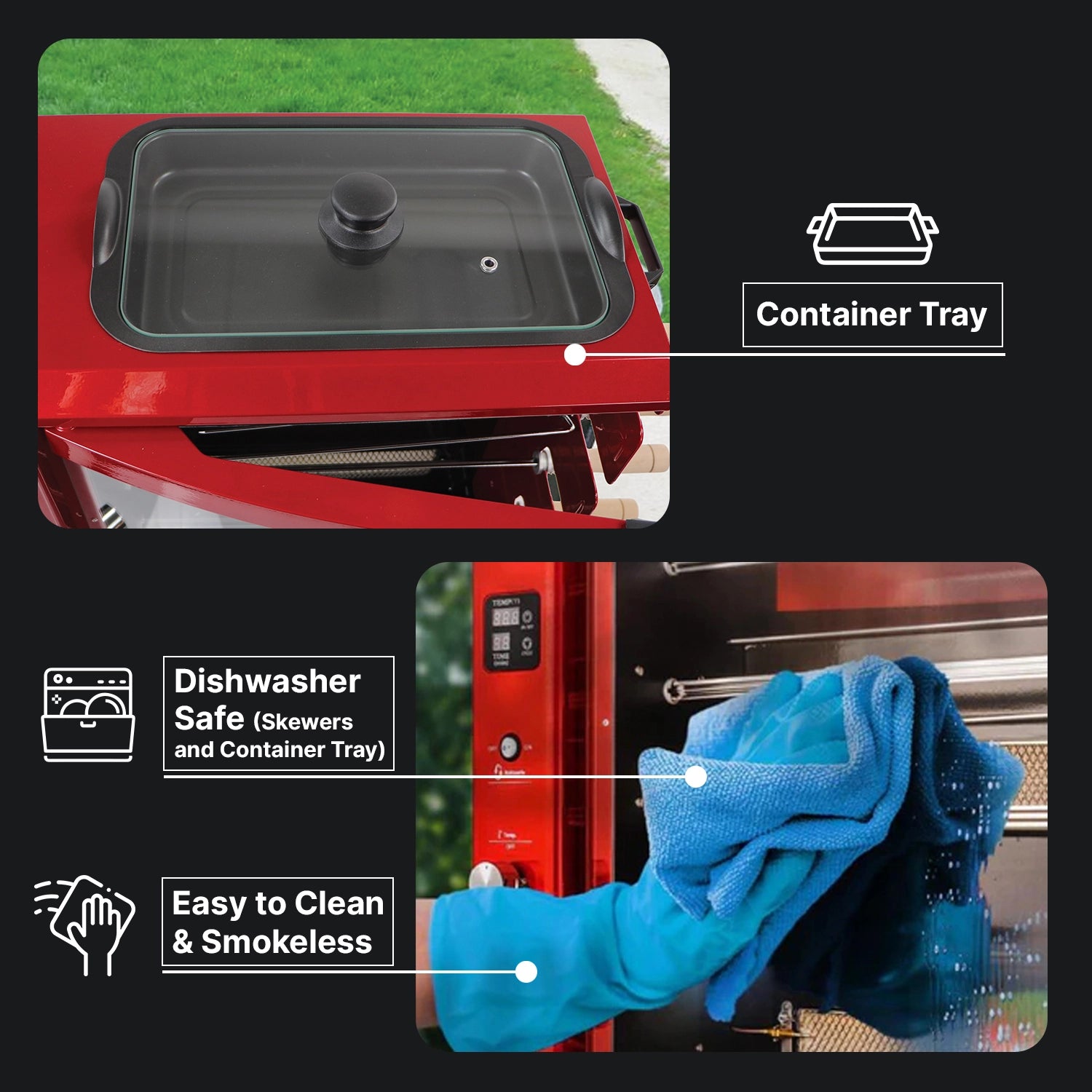 - EASY-TO-CLEAN & SMOKE-FREE: This rotisserie grill is quick and easy to clean because it has a modern design and a tray for collecting grease. It also has cutting-edge technology that lets you get real BBQ flavor without smoke.