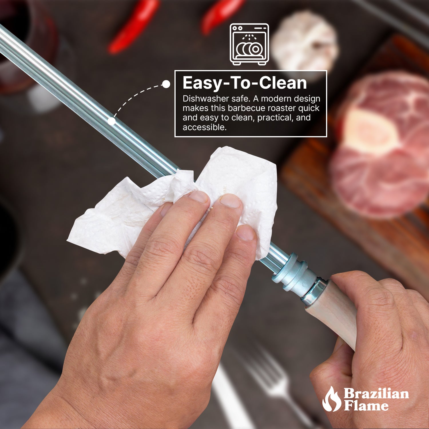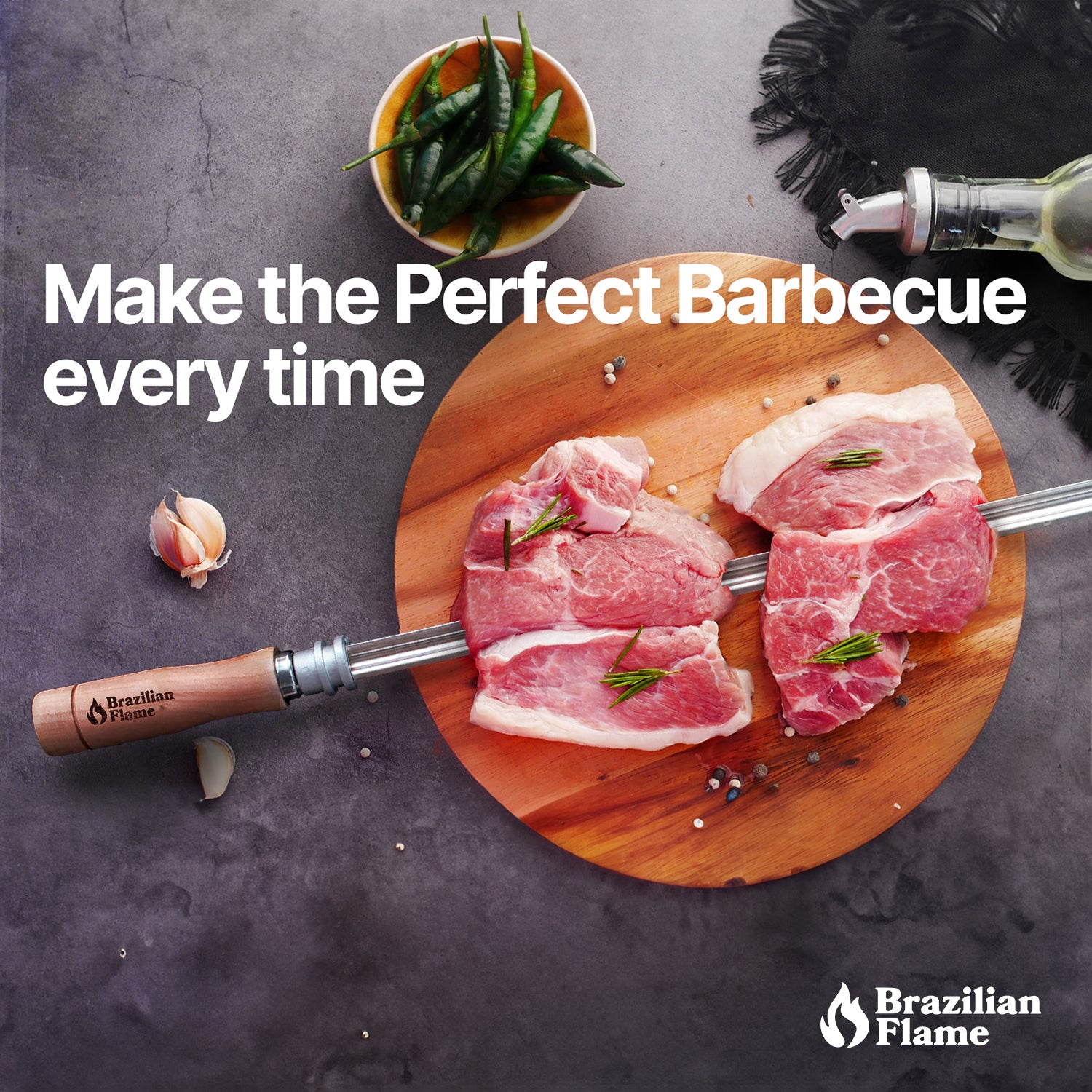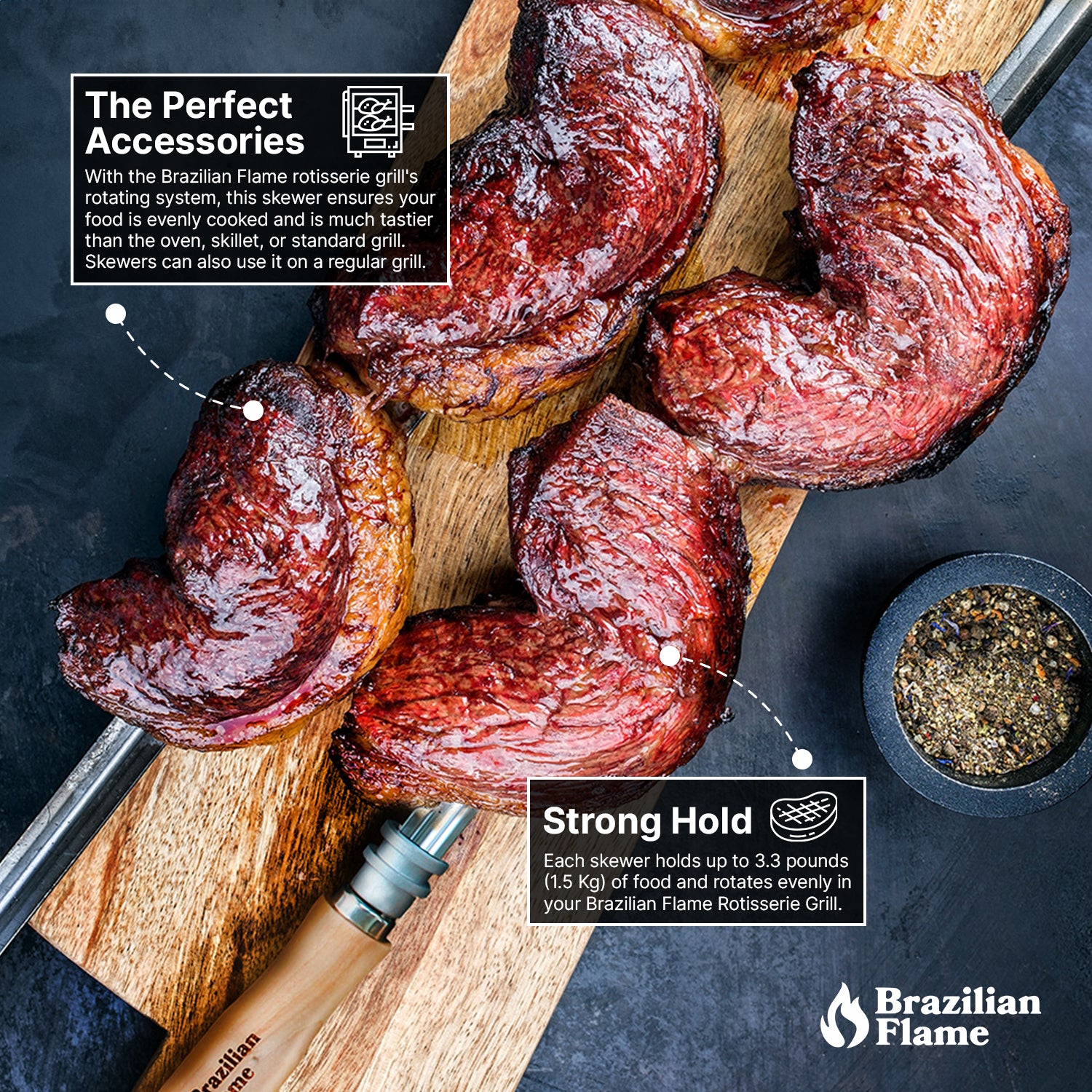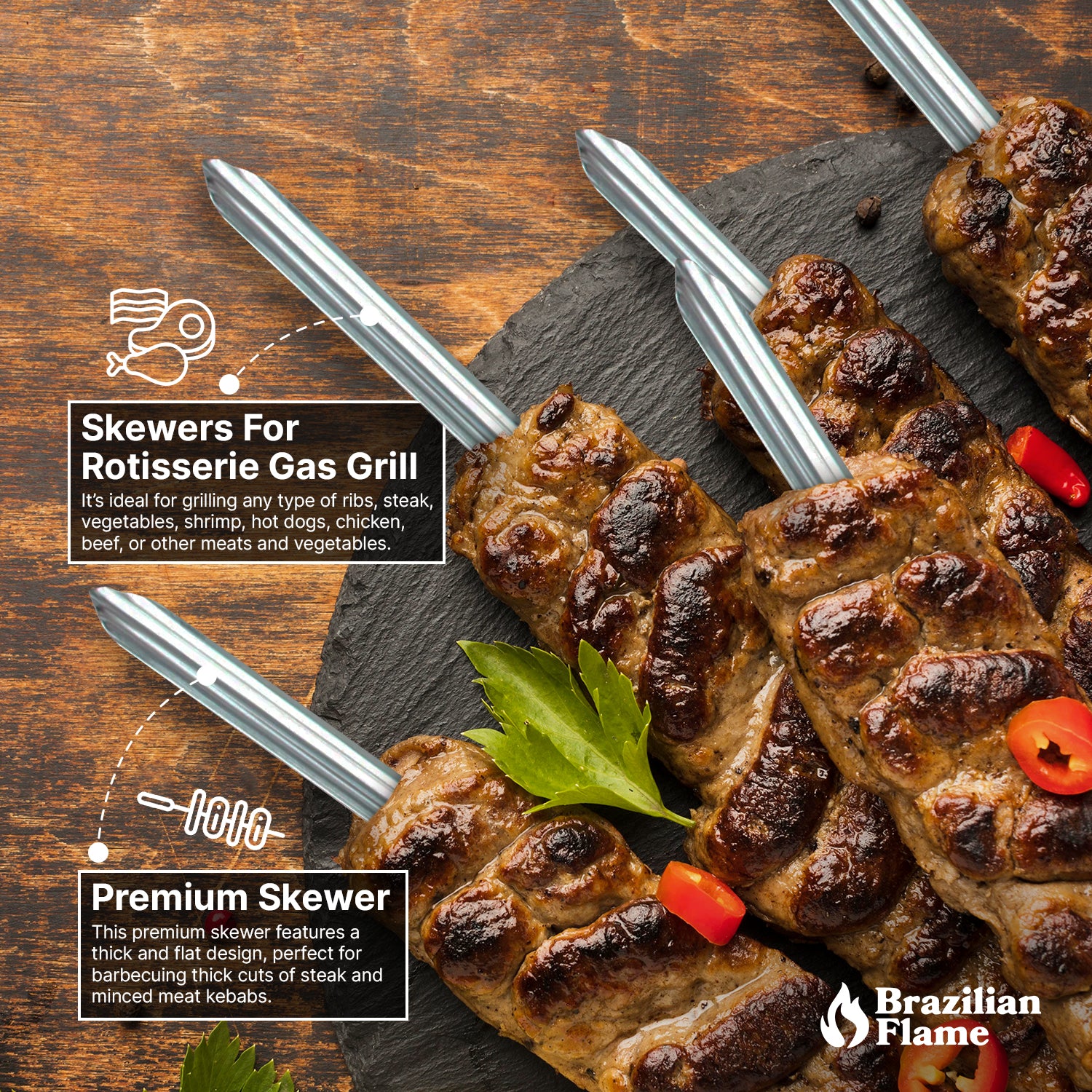 With the Brazilian Flame rotisserie grill rotating system, this skewer ensures your food is evenly cooked and is much tastier than the oven, skillet, or standard grill. Skewers can also use it on a regular grill.
